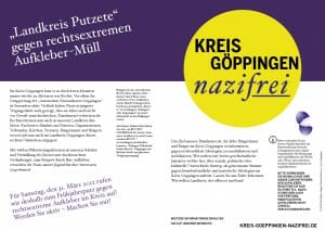 Bringen Sie uns einen kleinen Beweis Ihrer eigenen „Putzaktion“ durch Reste eines entfernten Nazi – Aufklebers, einem Handy-Schnappschuss bei Ihrer persönlichen „Putzete“ in Geislingen*, Eislingen* oder Göppingen* an unsere Infostände in den Fußgängerzonen!