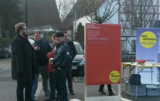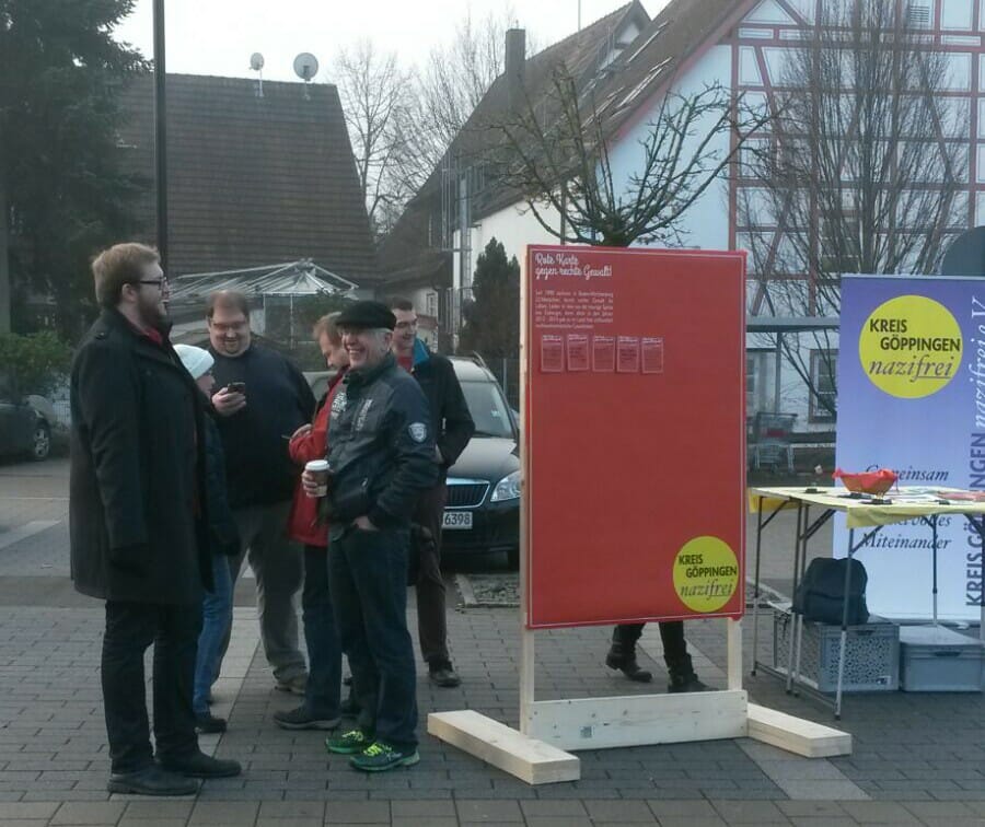 Mit dieser Aktion setzten wir am Samstag, den 05.12.2015, von 9.00 Uhr – 13.00 Uhr auf dem Vor-/Parkplatz des Kulturzentrum Uditorium in Uhingen ein Zeichen gegen Fremdenfeindlichkeit und rechte Gewalt, da es insbesondere in der Stadt Uhingen in letzter Zeit vermehrt zu Neonazi-Aktivitäten und rechter Stimmungsmache gegen Asylbewerber kam. Gleich nebenan informierten der SPD Ortsverein Uhingen und die lokale Flüchtlingsinitiative RefugiU über die Themen Asyl und Rechtsextremismus.
