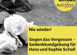 Nie wieder! Gegen das Vergessen – Gedenkkundgebung für Hans und Sophie Scholl, Marktplatz Göppingen, 22.02.2025, 10:00 Uhr