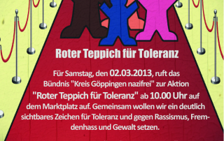 Einsatz der Polizei Eine Gruppe von Rechtsextremen ist am Samstag auf dem Göppinger Marktplatz gewaltsam gegen Demonstranten des Bündnisses „Kreis Göppingen nazifrei“ vorgegangen. Ein Polizist und ein Demonstrant wurden dabei verletzt. Roter Teppich für Toleranz Alex Maier vom Bündnis „Kreis Göppingen nazifrei“ hätte die Veranstaltung gern als rundweg positiv und gut gelungen bezeichnet. „Wir haben viel Aufmerksamkeit und Zuspruch erhalten. Den 20 Meter langen ’Roten Teppich für Toleranz’, d [...]