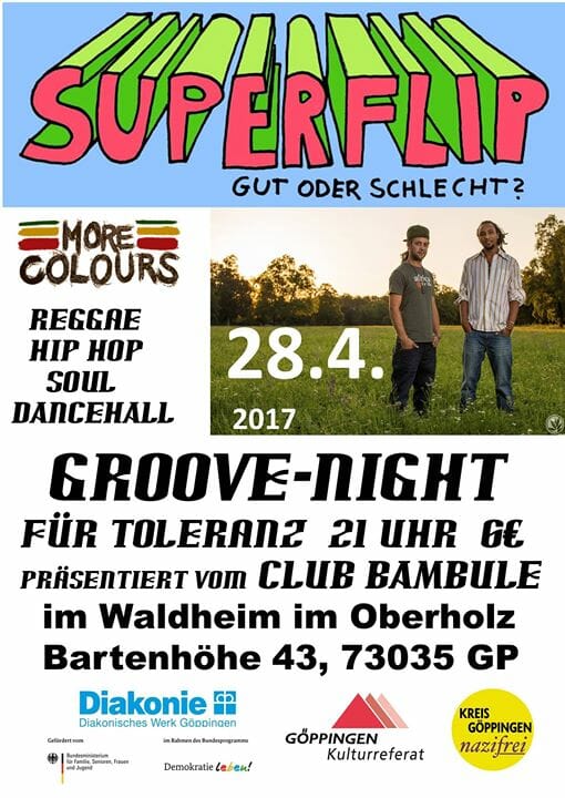 Die Groovenight für Toleranz mit einem der erlesendsten Live-Groove-Line Ups des Jahres verspricht souligen Disco-Funk mit der Kultband Superflip sowie Reggae, Hip Hop, Soul und Dance-Hall mit More Colours die ebenfalls im Club Bambule bereits im Dezember für Furore sorgten.