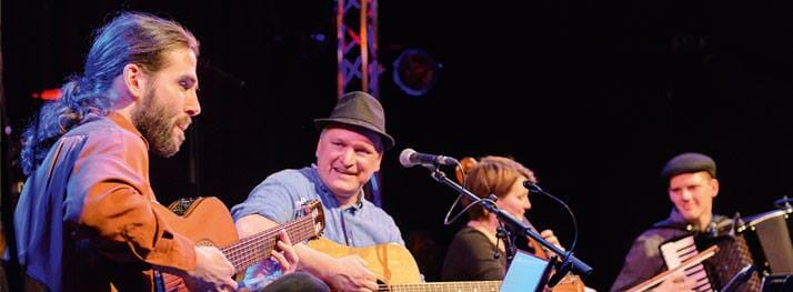 Den passenden musikalischen Rahmen bieten die Grenzgänger aus Bremen mit ihrem Programm „Und weil der Mensch ein Mensch ist“. Die Band feiert den Mut und die Zivilcourage der vielen tausend Menschen, die sich gegen eine unmenschliche Diktatur wehrten. Sie singen und spielen Lieder und Texte aus den Lagern und Gefängnissen des NS-Staates und dem Widerstand gegen das Hitler-Regime. Michael Zachcials ausdrucksstarke Stimme, Frederic Drobnjaks mitreißendes Gitarrenspiel, Annette Rettich am Cello und Felix Kroll am Akkordeon schaffen dabei „Unverwechselbares von bisweilen träumerischer Eleganz“. (Nordseezeitung)