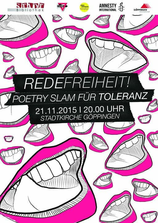 Zur Redefreiheit, dem Poetry Slam für Toleranz laden wir in die Göppinger Stadtkirche ein. Die CLUB BAMBULE-Veranstaltung wird im Rahmen des Bundesprogramms „Demokratie leben“ gefördert und mitgetragen von Amnesty International, der Stadt Göppingen, Kreis Göppingen Nazifrei.