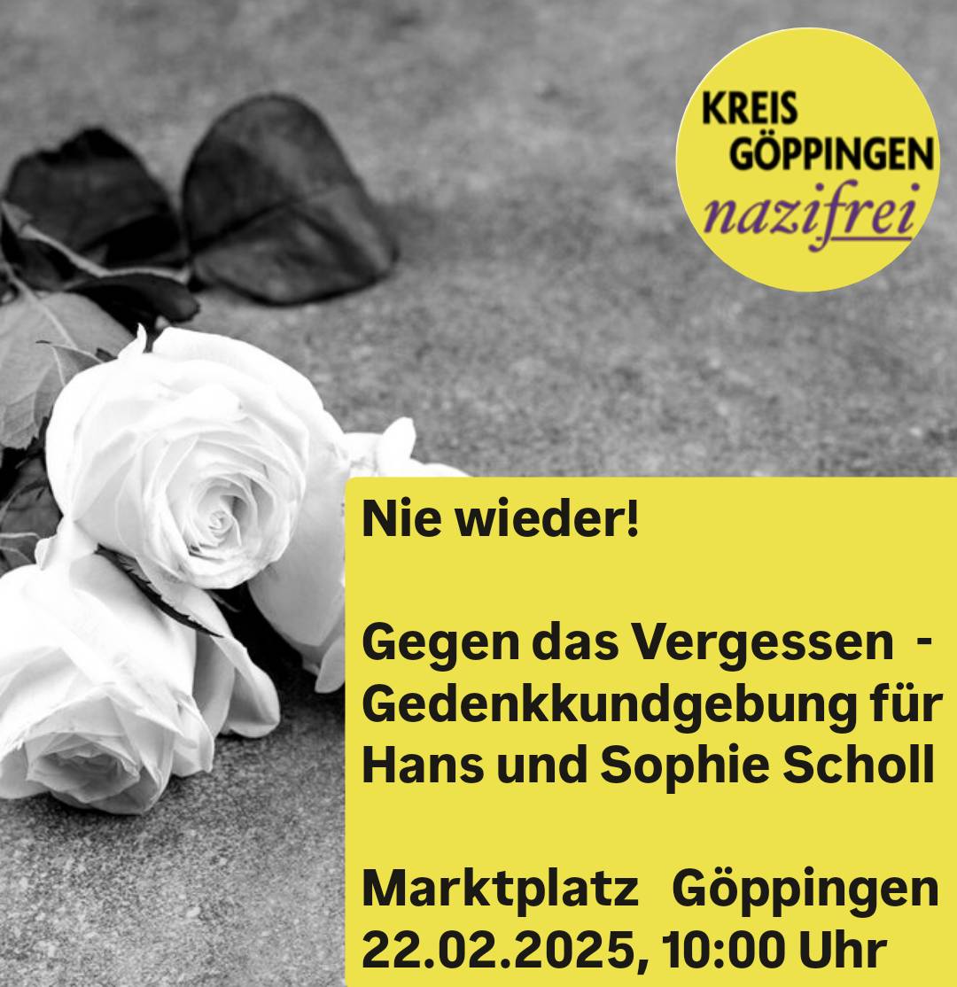 Marktplatz, Göppingen Marktstr. 22, GöppingenNie Wieder! Gegen das Vergessen. Gedenkkundgebung zum Todestag von Hans und Sophie Scholl und Christoph Probst Am 22. Februar 1943 wurden die Geschwister Hans und Sophie Scholl sowie ihr Kommilitone Christoph Probst vom nationalsozialistischen „Volksgerichtshof“ zum Tode verurteilt. Noch am selben Tag wurden sie enthauptet. Alle drei waren Mitglieder der „Weißen Rose“, einer studentischen Widerstandsgruppe gegen die NS-Diktatur. In sechs Flugblättern, geschrieben und verteilt zwischen 1942 und [...]